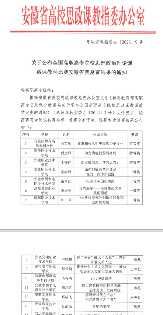 学院高度重视此次优秀微课评选活动,积极选拔推荐优秀教师参加比赛,参赛教师精心设计教学方案,反复打磨教学内容,将党的二十大精神有机融入思政课的相关章节和知识点中,用心打造“优秀微课”。两位老师凭借前期认真的准备、扎实的基本功、出色的现场表现,最终取得骄人的好成绩,充分展示了我校马院教师扎实的教学功底、过硬的教学能力和良好的教学风采。据悉,根据复赛结果,韩芳勤、芮齐清将代表安徽省分别参加全国高职高专院校思政课微课教学比赛、长三角高职高专院校思政课微课教学比赛的激烈角逐,两位老师正在积极备赛,有望再创佳绩。