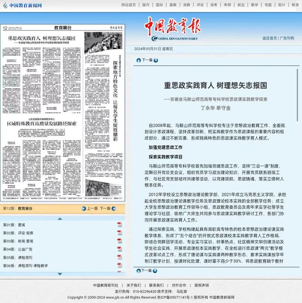 自2008年起,马鞍山师范高等专科学校专注于思想政治教育工作,全面规划设计思政课程,坚持改革创新,把实践教学作为思政课程的重要内容和组成部分,通过不断完善,形成独具特色的思政课实践教学育人模式。